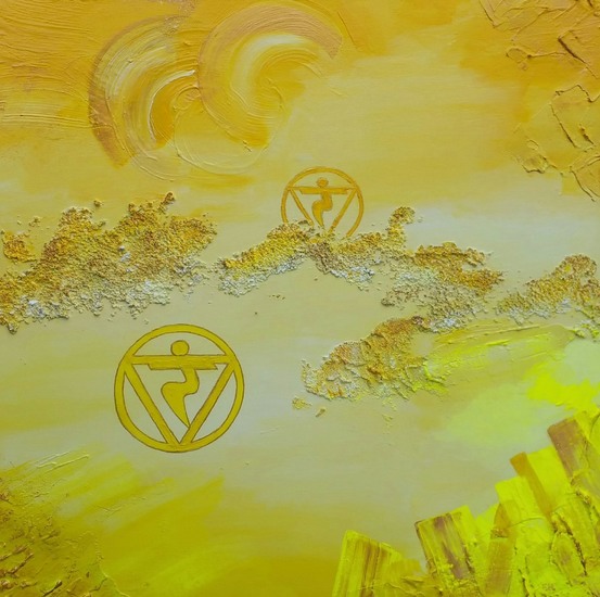 "Solar Salutation" is het vierde schilderij in een reeks over de 7 hoofdchakra's. Gesymboliseerd door de kleur geel.