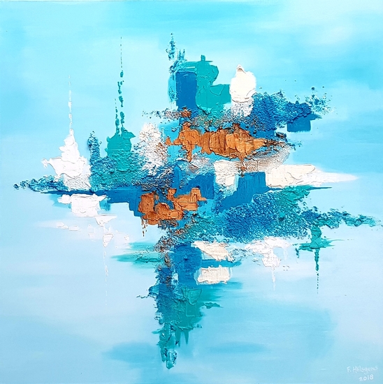 "There's too much blue in missing you" is een kunstwerk waarin de kleur blauw centraal staat. De vormen onstaan vanuit het midden van het schilderij en verspreiden zich in de vier windrichtingen. Er zitten structuurlagen in die dit keer de randen va het werk niet raken.Ik heb bewust gekozen voor een wat rustiger kleurenpalet dan in mijn overige werken omdat de kleur blauw bij mij voor rust en balans zorgt wanneer ik op wat voor manier dan ook onrust in mijn lijf waarneem.