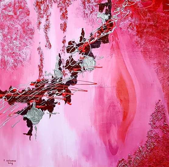 "We will glow" is een abstract werk dat enerzijds mysterieus en betoverend is, anderzijds is het vurig en vol hartstocht. Een moment van pure passie, vol overgave vastgelegd op doek met gebruik van diverse structuurmaterialen.