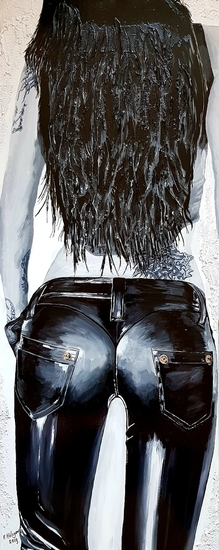 "Rock Bottom" is een realistisch schilderij van een stoere "rockbitch" met een wilde haardos en voorzien van een aantal tattoos. Ze draagt een skinny leren jeans waarin haar fraaie billen perfect uitkomen. Door de afsnijding en de afmetingen van dit doek is er zeker sprake van een opmerkelijke compositie. Ik heb dit keer slechts gebruik gemaakt van de kleuren zwart en wit en een klein beetje zilver om enkele accenten te zetten.