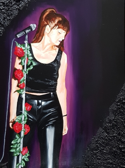 In 2017 ontstond het schilderij "Carillo". Mensen die mij goed kennen wisten dat ooit het kunstwerk "Golden" zou volgen. "Golden" is een eerbetoon aan mijn goede vriendin Annie Golden. Het zou kunnen dat je haar kent als zangeres. Ze vormde in de jaren 90 met Frank Carillo het duo "Golden Carillo". Daarvoor had ze eind jaren 70 bekendheid gekregen met haar band The Shirts. Deze uit NYC afkomstige formatie scoorde hits met "Tell me your plans"en "Laugh and walk away". Het zou ook kunnen dat je haar werk als actrice kent. Ze speelde o.a. de rol van Jeannie in de filmversie van Hair (Milos Forman), maar had ook een rol in "Twelve Monkeys", "One way out", " Baby Boom", "Desperately Seeking Susan", "Prelude to a kiss", "Miami Vice", "Cheers", "Law and order" en recent "Orange is the new Black". Anno 2019 zingt Annie nog steeds, maar vooral in musicals op Broadway. Ik heb Annie ontmoet in 1994 en tot de dag van vandaag zijn we bevriend. Het schilderij toont Annie in een voor haar typerende houding, zoals ze op het podium stond in 1997 , de roosjes om de microfoonstandaard mochten nooit ontbreken. Het was net als bij het schilderij van Frank niet de bedoeling een zuiver lijkend portret te maken, maar om de sfeer te vangen die het duo "Golden Carillo" zo uniek maakte.