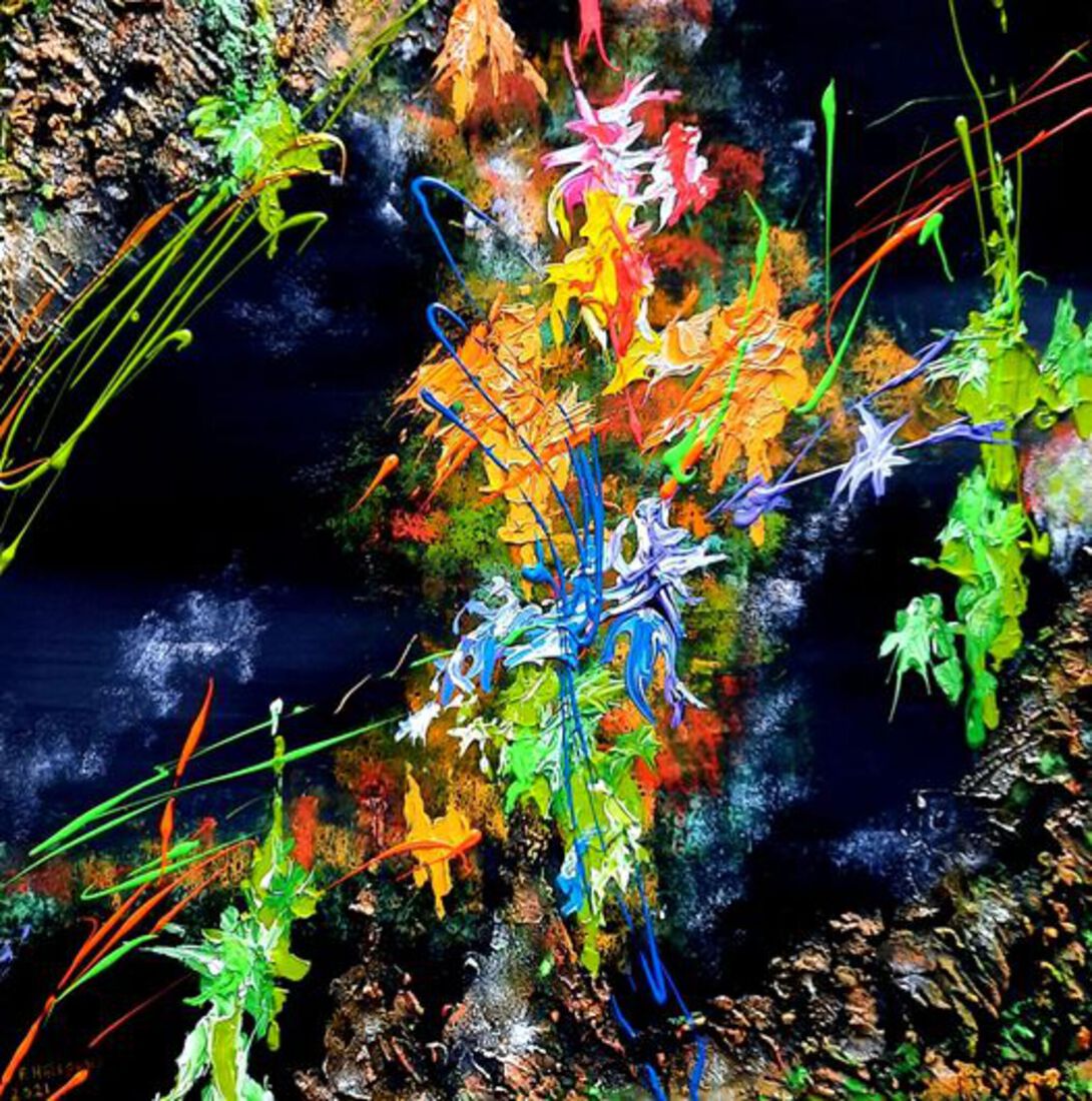 "Euphoria"is mijn eerste schilderij in 2021. Het is een kunstwerk dat hoort bij de serie werken die ik gestart ben in 2019 en waarbij ik voor een zeer donkere achtergrond gekozen heb. Het contrast met de geabstraheerde voorstelling is in dit werk extreem sterk. daar is zeer bewust voor gekozen, evenals voor de diversiteit in het kleurenspectrum. "Euphoria" laat namelijk een explosie aan felle fluoriserende kleuren zien die hoop en vertrouwen uitbeelden naar de toekomst in deze sombere periode waarin we ons nu al dik een jaar bevinden.