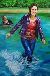 2016Schilderij van twee vrouwen die op een zomerdag volledig gekleed een duik genomen hebben in een meertje.