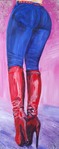 2019"Rock Bottom" is een realistisch schilderij van een stoere "rockbitch" met een wilde haardos en voorzien van een aantal tattoos. Ze draagt een skinny leren jeans waarin haar fraaie billen perfect uitkomen. Door de afsnijding en de afmetingen van dit doek is er zeker sprake van een opmerkelijke compositie. Ik heb dit keer slechts gebruik gemaakt van de kleuren zwart en wit en een klein beetje zilver om enkele accenten te zetten.